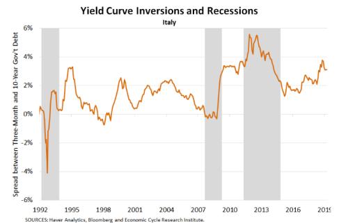 如下圖,義大利3個月期和10年期限的國債收益率曲線出現下滑。