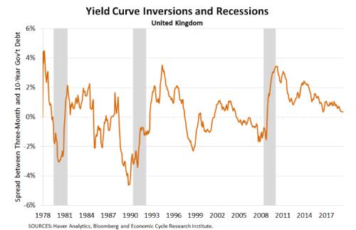 如下圖,英國3個月期和10年期限的國債收益率曲線接近倒掛。