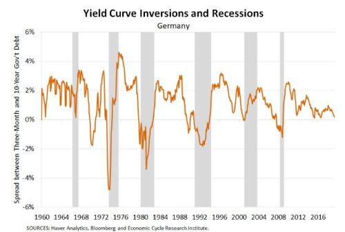如下圖,德國3個月期和10年期限的國債收益率曲線已經出現倒掛。