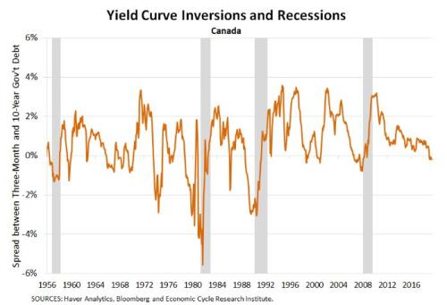 如下圖,加拿大3個月期和10年期限的國債收益率曲線已經倒掛。