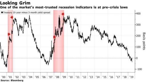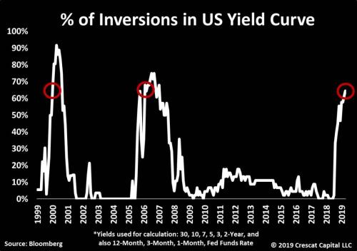 目前,除了3 個月和10年期國債收益率出現倒掛之外,有65%的國債收益率曲線,也已經出現了倒掛情況。這種局面都曾經出現在2006年和1999年的兩場世界級的經濟危機當中。
