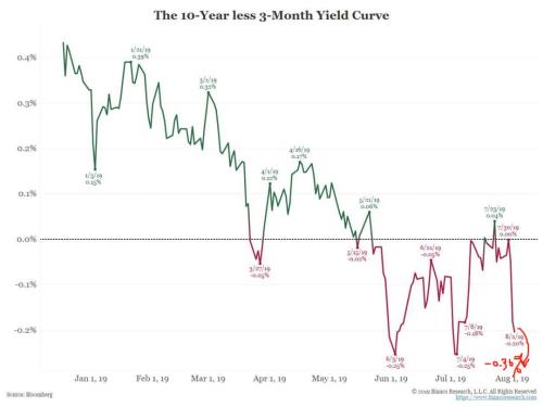 美國10 年國債收益率代表長端利率,3 個月國債收益率代表短端利率。8月6日,3 個月和10年期國債收益率倒掛一度達到了36個基點。
