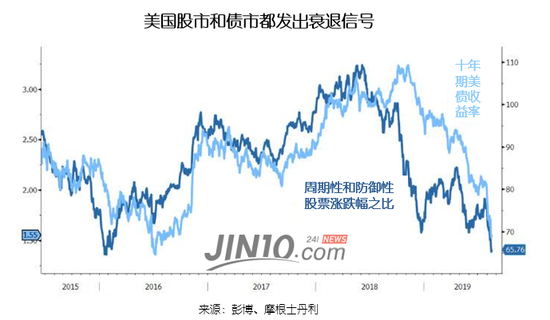 週期性股票的表現也在實證「週期中期」看法的謬誤。目前,週期性股票表現相對弱勢,上週週期性和防禦類股之比更是加速下滑。目前,週期性與防禦性股票之比隨著十年期美國國債殖利率加速下跌,兩者走勢幾乎已完全同步。這或表明,市場對於經濟衰退的恐慌比2016年的時候更嚴重。