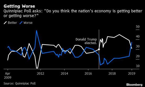 一項新的Quinnipiac民調顯示,37%的受訪者認為經濟正在下滑。表示經濟有改善的受訪者佔比為31%。只有30%的人認為經濟基本持平,為有紀錄以來的最低水平。
