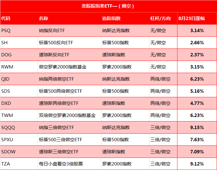 做空美股,聚焦這四大指數,基本就夠用了。而美股ETF,最多還能加到三倍槓桿,意思是指數跌1%,相關的三倍槓桿反向ETF會漲3%左右。下表,我們列出了關聯這些指數的反向ETF,根據不同的風險偏好,可以選擇不同的槓桿倍數。