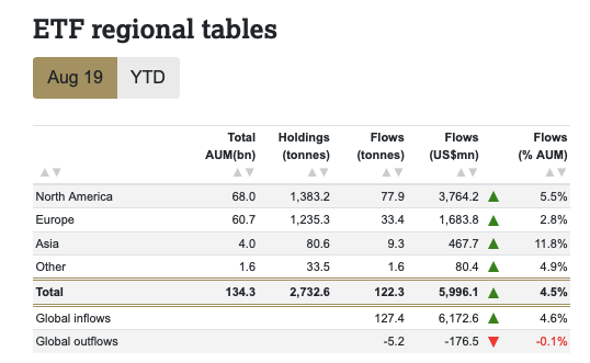 而黃金價格8月繼續上漲約7%,使得全球黃金ETF的資產管理規模增長至1340億美元。