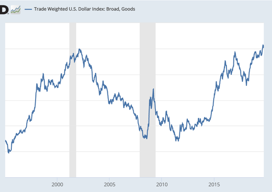 首先,美元走強損害了跨國公司利益。由於美元走強,對美國以外的企業而言,進口美國商品的成本就會提高,營收相對而言也就減少,損害了企業收益。對美國公司而言,出口商品價格較高,商品在海外市場就沒有競爭力,難以開拓海外市場。