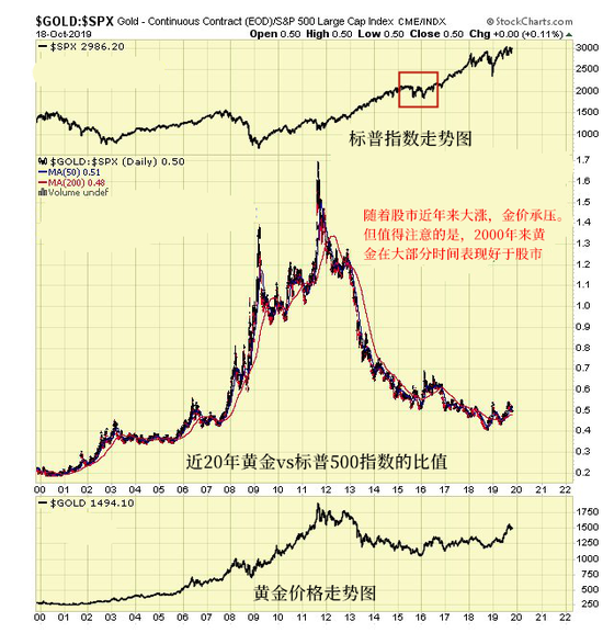 下圖展示了20年間黃金和標普500的走勢圖,我們可以看到這20年間,黃金的表現在大多數時候都優於標普(比值大於1),只是2012年起標普500指數的節節高攀超越了黃金的漲勢,而時值美國聯準會在推行QE3。