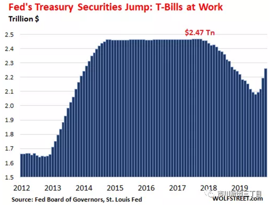 聯儲在過去幾年裡並沒有持倉美國短期國債。但聯儲在今年年初換了打法,將一部分到期的長期限美國國債替換成短期國債。其後在回購市場發生動盪後,聯儲決定將給華爾街上的小伙伴們輸血廉價的資金。聯儲表示準備通過回購操作每個月買進600億美元的美國短期國債。自7月份以來聯儲共買入1790億美元的美國國債,其中10月份買入770億美元,11月份買入650億美元,這兩個月的月度增量為2008年金融危機以來最多。