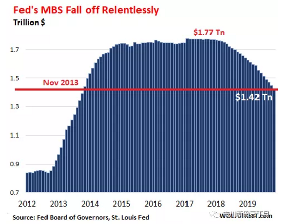 包括聯儲在內的按揭質押債券的持倉機構每個月均會收到按揭質押債券背後的按揭質押貸款每月還本付息的金額。在聯儲的資產負債表上有大約95%的按揭質押債券的未償期限不低於10年,如今其持倉的減少幾乎全部來自於按揭質押貸款的還本付息對按揭質押債券本金的沖銷。
