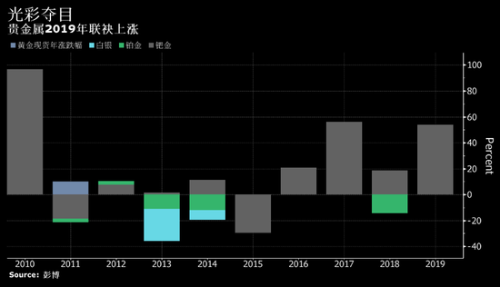 在其他貴金屬中,白銀全年上漲15%,是2010年以來的最佳表現。鉑金上漲22%,是2009年以來最大年漲幅,而表現最好的鈀金上漲了54%。
