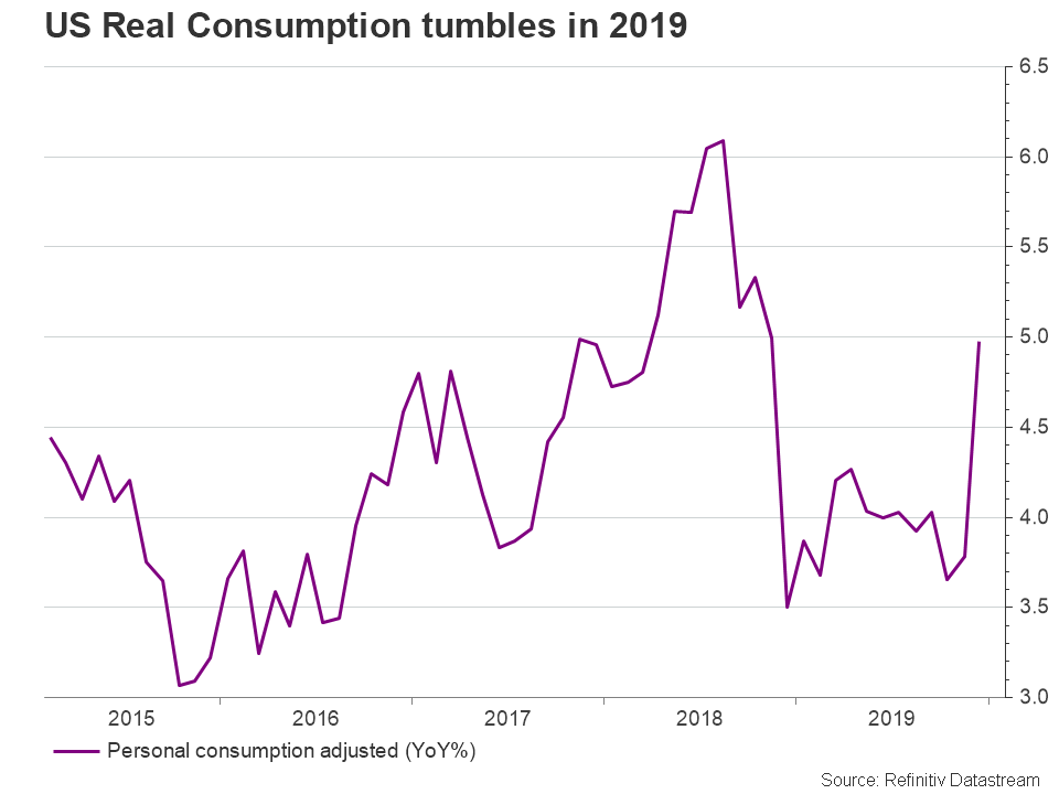 2019年,美國的通膨率一直在下滑,從2.0%降至1.5%,然後在12月回升至1.6%。在2019年全年,美國的實際消費者支出也有所下降,增長了4.0%,是三年來最小增幅,不及2018年 5.8%。值得注意的是,在最新的貨幣聲明裡,美國聯準會對於美國家庭支出增長的描述從之前的「強勢」改為「適度」。因此,面對影響消費的措施,市場可能變得敏感。