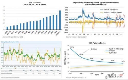 第一,眾多指數的隱含波動率較前5年增加5個標準差。第二,由於高位修正,標普500指數隱含波動率相關性已經升自2018年2月以來最高位。第三,隱含波動率變化符合最近交易量異常飆升的情況。