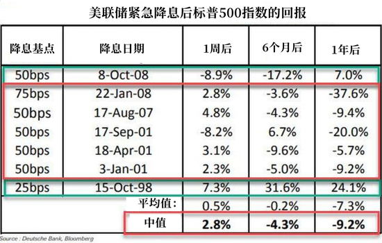 德意志銀行的吉姆•裡德(Jim Reid)觀察了美國聯準會最近7次緊急降息後,標普500指數一週、六個月和一年內的變化: