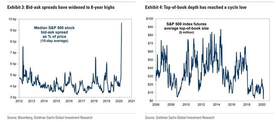 按照高盛(158.67, 4.01, 2.59%)的測量方法,美股的流動性已經來到了金融危機以來最糟糕的時候,這也能解釋為什麼市場的漲跌顯得一驚一乍的。目前美股做市商提供的買賣價差爆炸般上漲,標普500期貨市場的市場深度也來到了有史以來的最低水平。