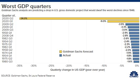 高盛預計,美國失業率將在今年晚些時候達到15%左右的峰值,遠高於最初預期的9%;預計第一季度GDP將下降9%,而第二季度降幅將達到驚人的34%,這將是第二次世界大戰以來最糟糕的數字。