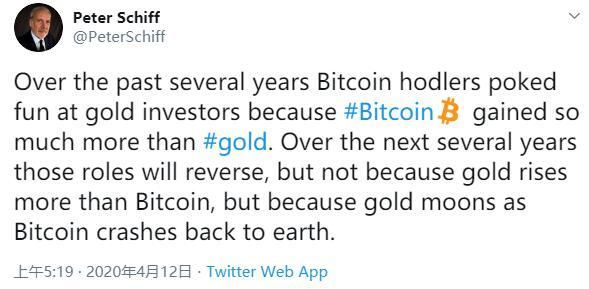 彼得‧希夫在4月12日發佈的一條推特中寫道,在過去的幾年裡,比特幣囤積者取笑黃金投資者,因為比特幣的收益遠遠超過黃金。在未來幾年,這些角色將發生逆轉,但不是因為黃金的漲幅超過比特幣,而是因為黃金飛上月球的同時比特幣會跌回地球。