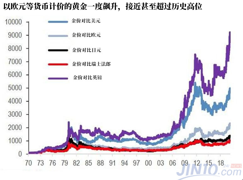 摩根大通指出,投資者的這些擔憂一定程度上也解釋了,為什麼雖然美元貿易加權指數(由美聯儲編制,採用26種貨幣作為參考)在上漲,但以歐元、日元、英鎊、瑞郎計價的黃金還是一度飆升,接近甚至超過歷史高位(以美元計價的黃金距離紀錄高點只差9%)。
