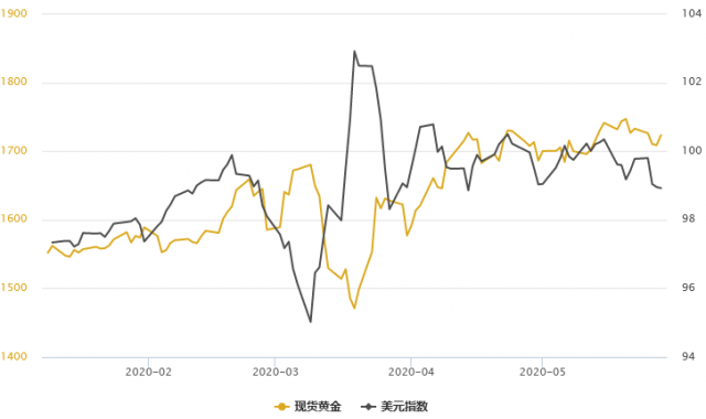 三連跌,徘徊於99大關下方,投資者對美國聯準會採取更多寬鬆行動抱有預期,黃金獲得一定吸引力。黃金短期回撤並不改變中期上漲的趨勢。一方面,美元實際利率處於負值的情況可能在未來幾個月很難改變。另一方面,美股等風險資產反彈後估值過高,和經濟增長的基本面脫節。