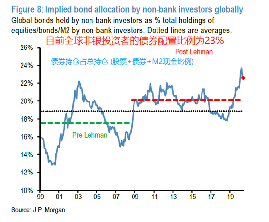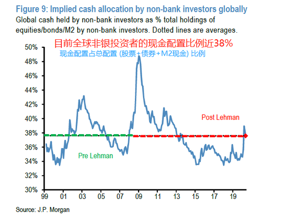 爲了證明全球非銀投資者當前的股票配置較低,摩根大通分析師將全球M2與全球非銀投資者持有的股票和債券持倉規模進行了比較。全球M2反映了非銀投資者的現金餘額,而非銀包括家庭、企業、養老基金、保險公司、捐贈基金和主權財富基金。據摩根大通計算,目前全球非銀投資者的股票配置比例爲40%,儘管自3月23日以來全球股市已大幅上漲,但仍處于後雷曼時代的低點。更重要的是,不僅當前40%的股票配置低于歷史平均水平,也遠低于2018年初49%的高點。摩根大通認爲,在高流動性和低利率的結構性利好背景下,未來可能重回這一水平。(圖1)
