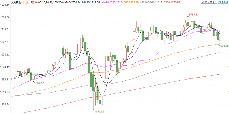 價格一度跌至1670支撐水平。數據顯示,5月美國新增非農就業250萬,遠超於預期的減少1000萬。失業率13.3%也比預期的20%好不少。
