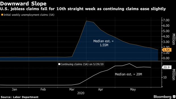 週四美國勞工部公佈的數據顯示,美國至6月6日當周初請失業金人數錄得154.2萬人,連續第10週回落,前值由187.7萬人修正為189.7萬人,預期值為155.0萬人。美國至5月30日當周續請失業金人數也較上週回落。