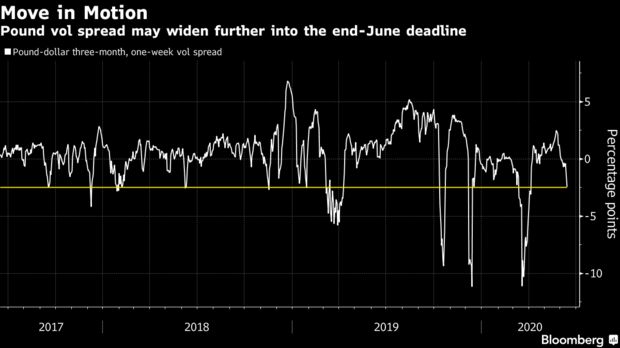 英鎊隔夜隱含波動率上升至16%,週三還不到11%。這反映了投資者在6月最後期限前交易者首次尋求對沖英國脫歐的尾部風險。