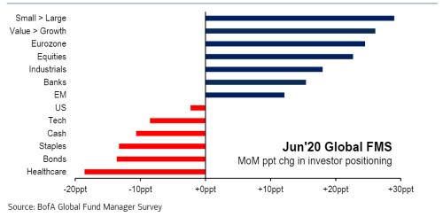 美銀美林對212名管理著5,980億美元資產的基金經理的調查顯示,這種樂觀情緒導致投資者現金水平從上個月的5.7%下降至6月份的4.7%,是自2009年8月以來的最大單月跌幅。