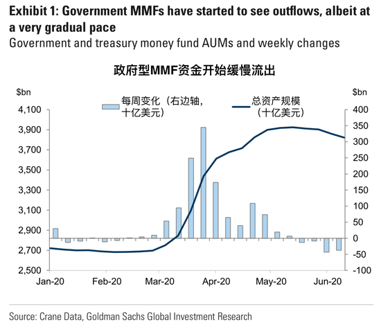 貨幣市場基金(Money market funds,簡稱MMF)是指投資於貨幣市場上短期(一年以內,平均期限120天)有價證券的一種投資基金,可作為衡量現金持倉的指標之一。當前美國貨幣市場基金的總資產高達4.62萬億美元,為1992年以來最高,超過了2008年金融危機時期的3.76萬億美元(圖1)。近期,政府型貨MMF的資金有開始流出的跡象,部分資金流向了優先型MMF(圖2)。
