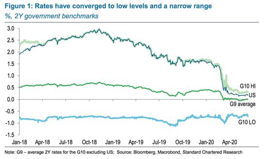 零利率或負利率已成為新常態:十國集團(G10) 的利率正在迅速收斂,2年期政府債券收益率不到2018年底時的三分之一。