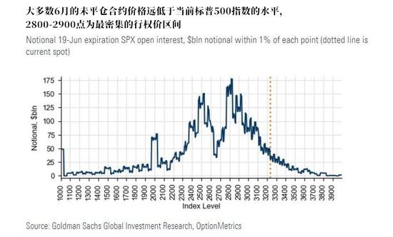 隨著行權活動增加,伽瑪值風險敞口相對較小。根據高盛的數據,標普的500指數伽馬值為800,與過去3年的四巫日相比相對較小。這是因為過去一個季度的市場動盪,6月份即將到期的標普500指數期權價格大多數都遠離當前指數水平。