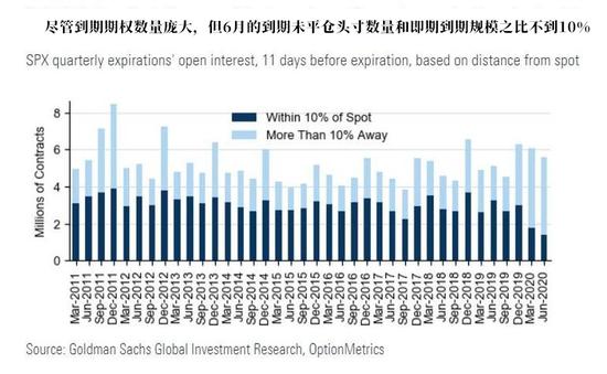至於另外一點,高盛數據顯示,6月19日將有1.8萬億美元的標普500指數(SPX)期權到期,這是有記錄以來期權到期規模第三大的、非12月的季末結算日(通常12月到期規模也比較大)。