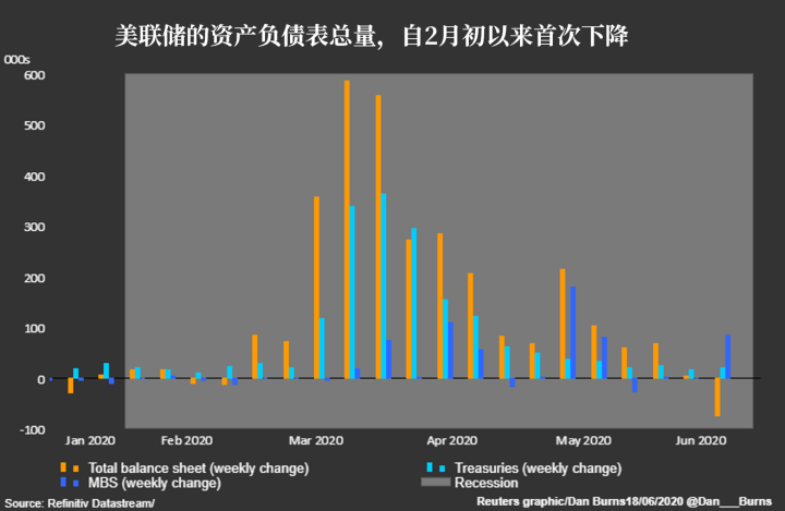 全球美元流動性危機緩解,14家中央銀行向美聯儲申請的貨幣互換餘額開始快速下降。美聯儲對歐盟,日本,英國,瑞士,澳大利亞等14個經濟體的注資總量由4500億美元已經下降到3000億美元以下,可以說美聯儲的危機應對機制之一——貨幣互換已經開始退出,資產負債表收縮已經開始。
