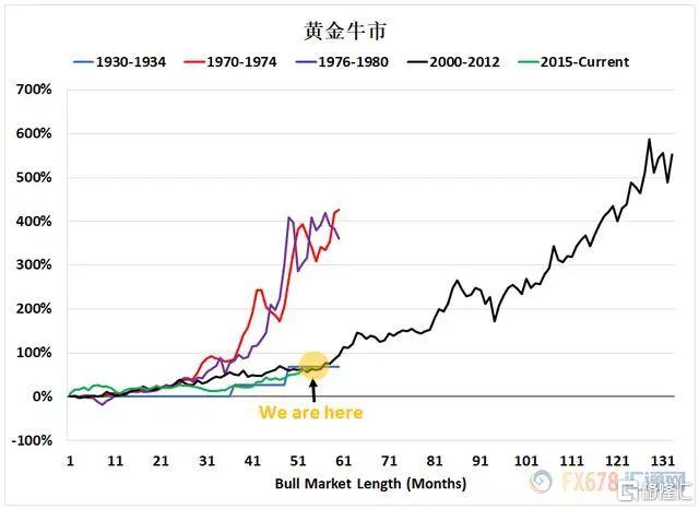 下圖顯示了以前的黃金主要牛市。除了1930至1934年和當前我們所處的黃金牛市,其他幾波行情黃金的漲幅都超過400%。以2016年1月為當前黃金牛市的低點,黃金已從低點上漲了69%。由於當期黃金價格的相對高位,此前400%漲幅的歷史可能不會重演,但了解當前推動金價的因素至關重要。