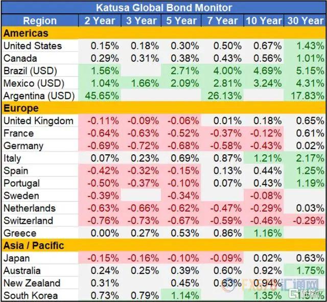 可以發現歐洲政府的債券收益率基本為負。渴望獲得收益的投資者與央行的負利率政策共同推動了大多數政府債券收益率進入負數區域。其他發達國家的債券收益率也緊隨其後。