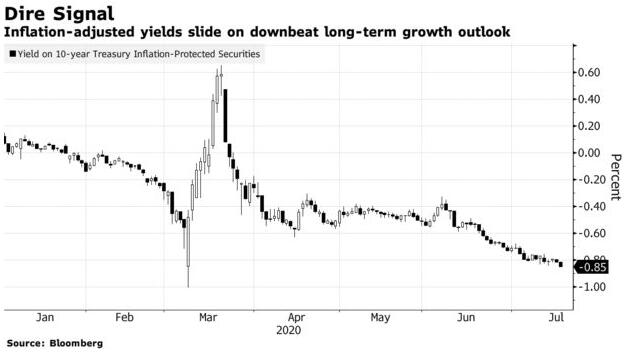 目前,美國股市已遠遠高於疫情大流行引發的2020年低點之上,但隨著美國許多州的新病例減緩了重啟計劃的速度,美國國債市場對經濟反彈步伐的懷疑日益升高— —10年期債券實際收益率由於剔除通貨膨脹,通常被視為更能單純預判經濟成長的數據,該收益率在過去六週都下跌,並徘徊在-0.85%左右。