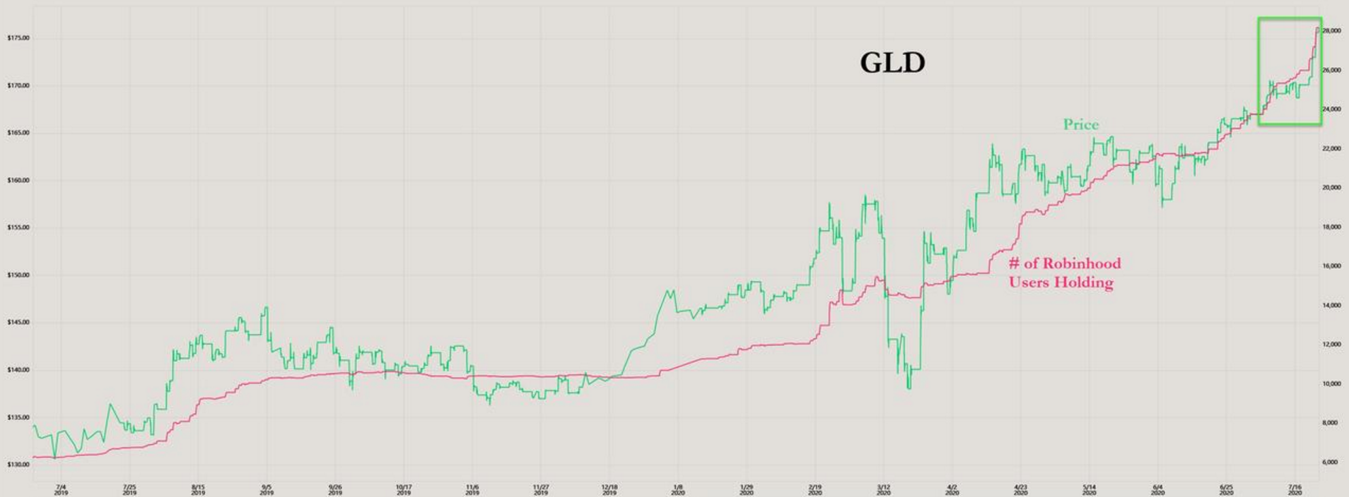 而美國的散戶,更是近期崛起速度最快、購金速度最驚人的一群多頭。如下圖所示,到目前為止,美國券商Robinhood的線上交易平台上,已有超過28000個散戶持有黃金ETF。