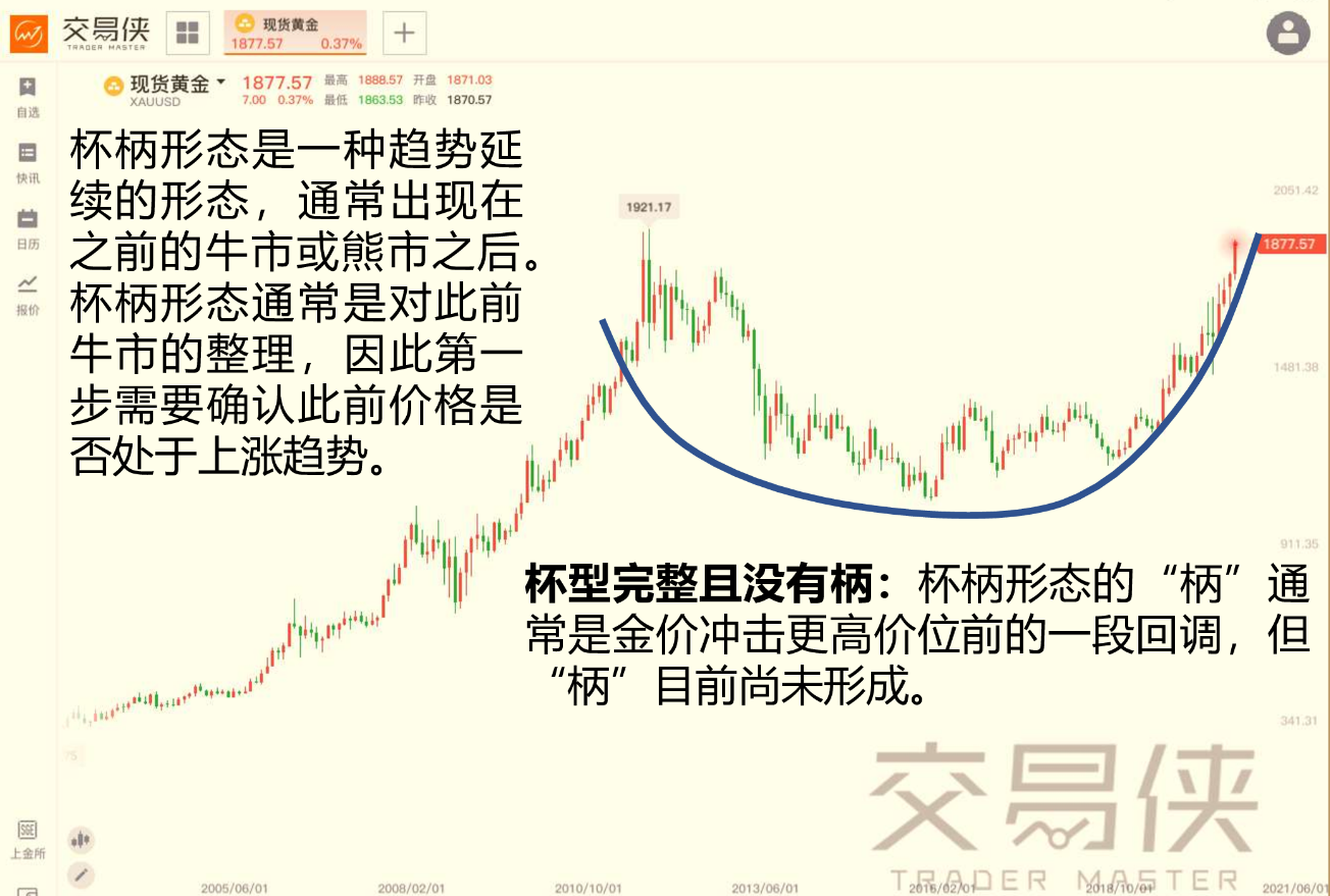 金十此前曾報導過,技術面上,黃金已經出現新一輪突破信號。從月線圖來看,黃金的走勢是一個標準的杯柄形態,這種形態通常出現在牛市或熊市之後,是對此前牛市的整理,在形成突破前需要確認黃金是否仍處於上漲趨勢。