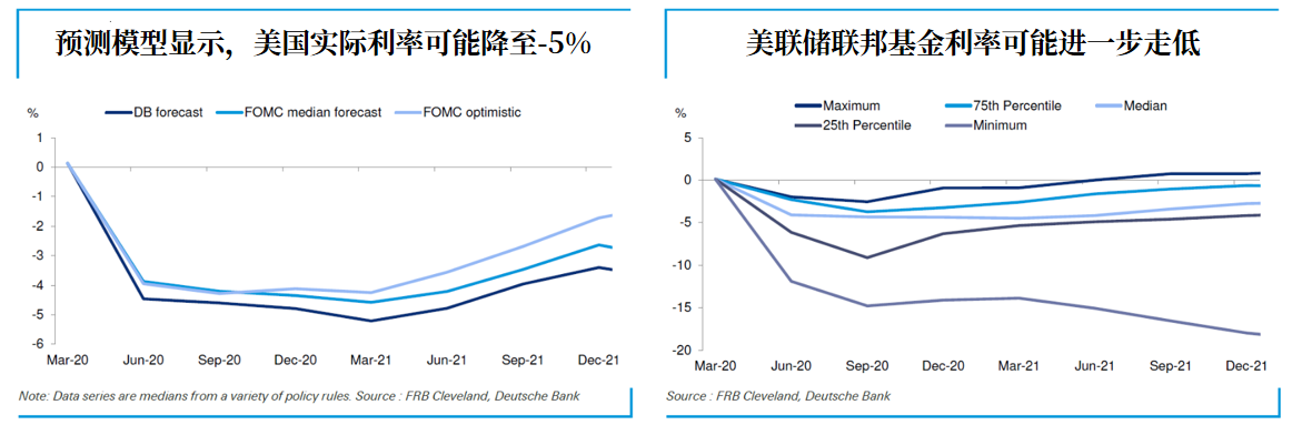 對於美聯儲的利率前景,克利夫蘭聯儲提供了一個預測模型。根據該模型,美聯儲的實際聯邦基金利率低至-5%,且未來一段時間的下行風險要遠高於上行可能性。該工具通過對通脹和失業率的量化測算,推導美聯儲的貨幣政策路徑。德銀首席美國經濟學家盧加蒂解釋了為什麼會出現這種結果: