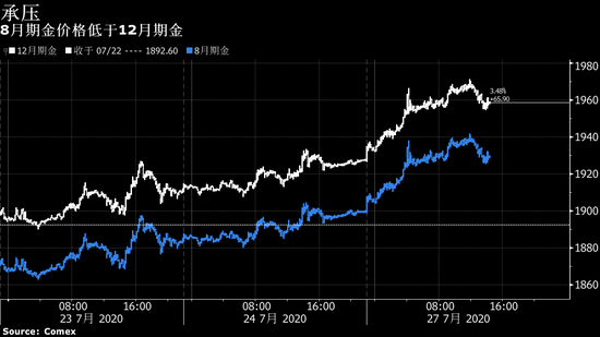 倫敦時間週一午前,8月期金在1,938.70美元/盎司交投,12月合約則要高出近30美元,在1,968.30美元/盎司。過去幾天,8月期金價格一直低於現貨金。