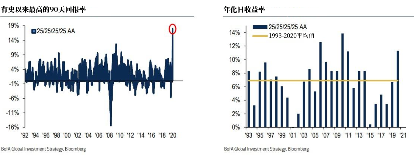 這使得最近備受美銀青睞的“全天候”(All-Weather)投資組合(股票、債券、現金、黃金等比例配置)在過去90天裡上漲了18%,創下歷史新紀錄,鑑於其7%的歷史年均漲幅,這一漲幅是“驚人且不正常的”。