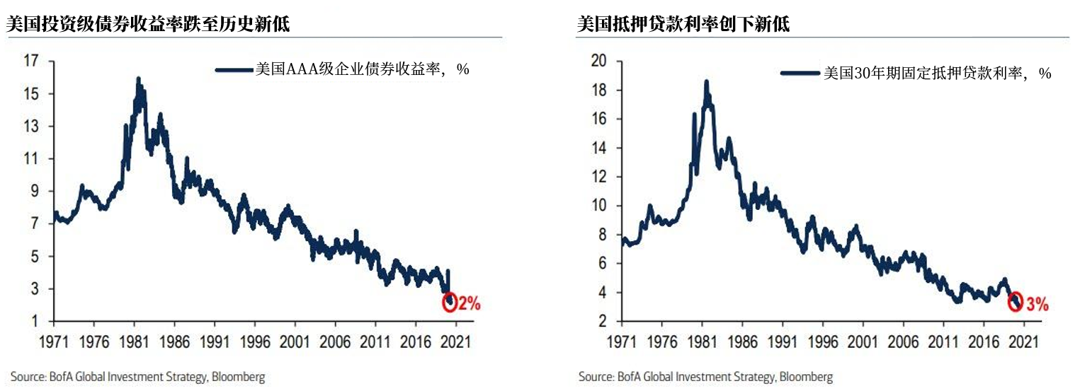 除了波動率,美聯儲對利率的壓制也對收益率產生了影響:美國商業抵押貸款支持證券(CMBS)和投資級(IG)企業債券收益率跌至2%,與此同時,美國30年期固定抵押貸款利率剛剛跌破3%,創下歷史新低。