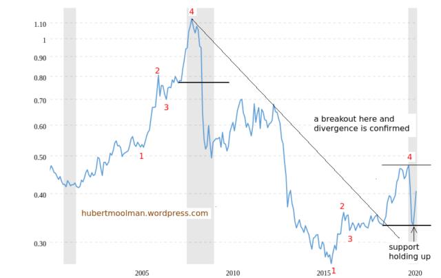 在2008年金融危機期間,該比值未能在低於點2(但高於點3)的水平獲得支撐,徑直下跌。但現在,點2的支撐位(高於點3)似乎還在維持,並且黃金正在強勢上漲中。