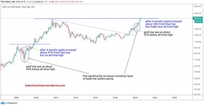 在2008年金融危機前後(基礎貨幣大幅增加期間),黃金跌至谷底,比當時的歷史高點低34%左右。大約4個月後,黃金較該低點上漲了47%,但沒有創下歷史新高,而是在出現低點的13個月後才創下歷史新高。