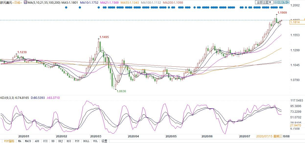 匯通網提醒,從日線圖上看,歐元兌美元在7月31日刷新近兩年高點1.1909,但進入8月份有所回調。綜合以上信息可以看出,雖然在就業和債務方面仍面臨挑戰,但整體來說,疫情期間美國的經濟比歐元區更為強勁。加上市場對美元的需求相比歐元更為強烈,這將對中長期歐元兌美元造成打壓。
