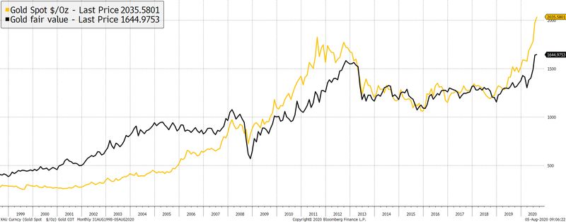 分析認為,當黃金處於牛市時,它會表現出進一步高於公允價值的傾向。因此,儘管黃金價格現在很昂貴,但仍比2011年底的前一個峰值便宜得多。