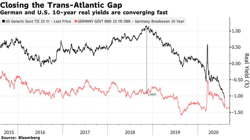 但現在我們來看看對黃金最重要的影響,即債券的實際收益率。與債券或銀行存款不同,黃金不支付利息。因此,當利率居於高位之際,持有黃金就意味著在錯失其他資產的收益。而當實際收益率為負時,黃金不支付利息就成為一種優勢。經通脹因素調整後的美國10年期公債收益率從年初的約0.1%降至負1.06%。實際收益率為負,這預示著美元將走弱,金價將走高。
