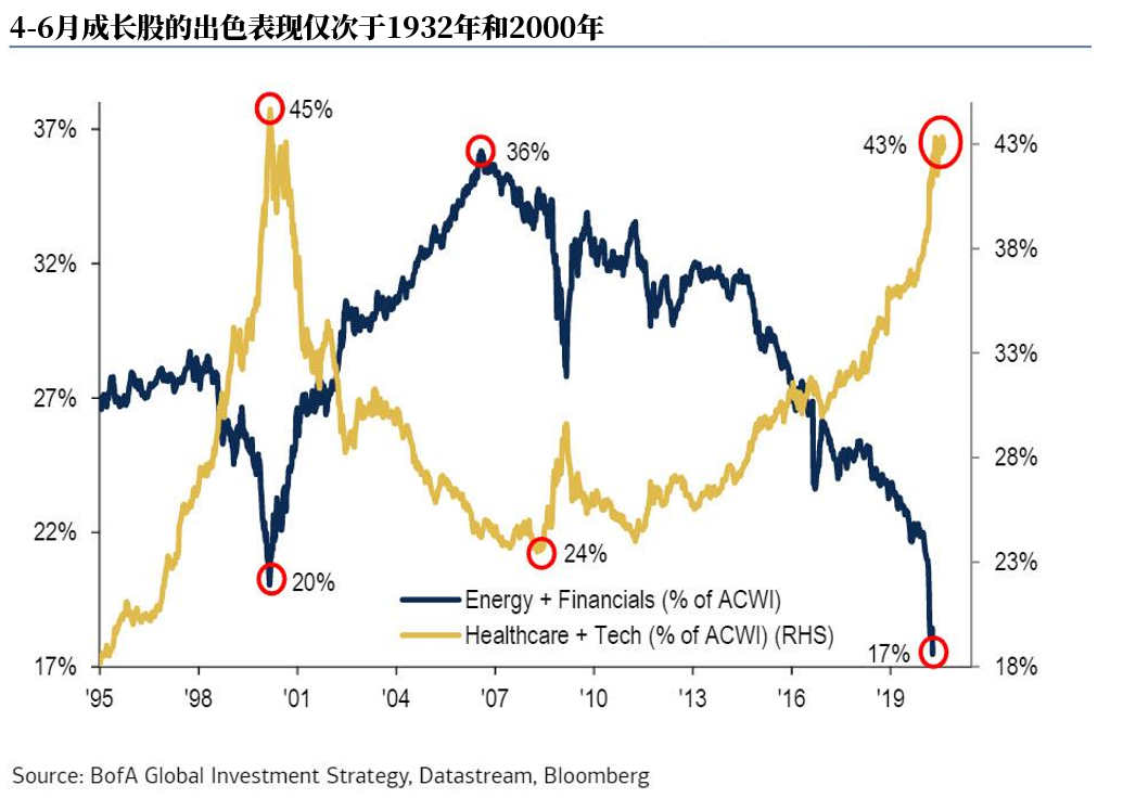目前,蘋果(503.43, 5.95, 1.20%)的市值(2萬億美元)幾乎完全與英國富時指數(2.2萬億美元)相當;2020年4月至6月期間,成長股相對價值股的漲幅程度,幾乎能與1932年10月和2000年1月相媲美。
