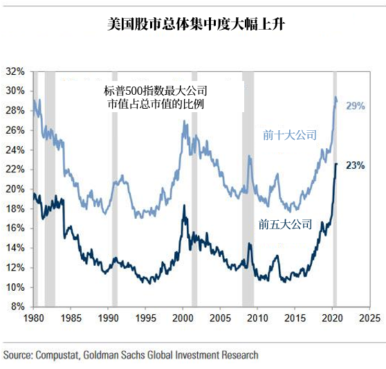 其背後的原因早已無人不曉:如下圖所示,標普500指數市值最大的五家公司總市值已占到前者的23%,創下了歷史新高,而僅前十家最大的公司就佔到了標普500指數總市值的將近三分之一(29%)。