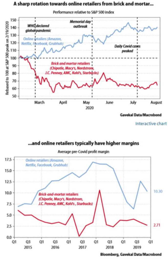 這種反彈進度分化的現象,一部分是疫情爆發後的經濟封鎖造成的。如下圖所示,百貨商店和零售電商之間的業績差距是巨大的,而且即便在疫情開始之前,在線銷售商的利潤就已經高得多了。經濟封鎖後,它們的差距更是進一步被拉大了。